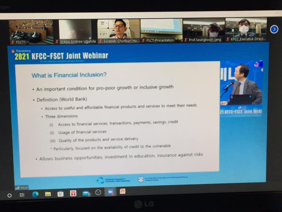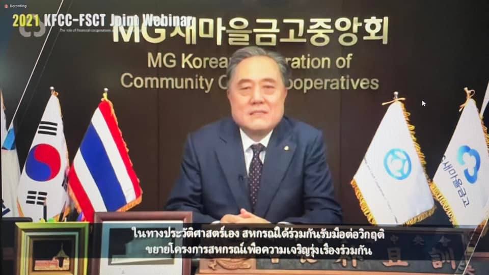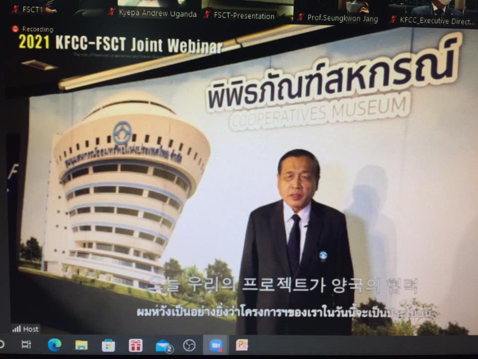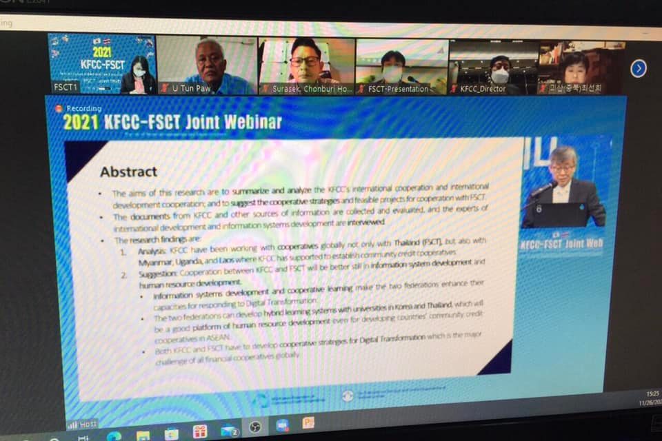 According to prolonged pandemic and travel restriction, FSCT and KFCC have agreed to provide virtual program again this year between Thailand and Korea. On November 29, we provided “2021 KFCC-FSCT Joint Webinar” on the theme of “The Role of Financial Cooperatives and Future Directions”. We were very pleased to be able to welcome all participants from Thai, Korean and all over the world. The program has contained the short videos of cultural exchange to help narrow the psychological distance between Korea and Thailand, speeches of the President from both organizations and lectures on “Financial Inclusion” and “ICT-based Cooperation” from lecturers of KFCC and FSCT. The program was very beneficial and fruitful for our network and movement.
