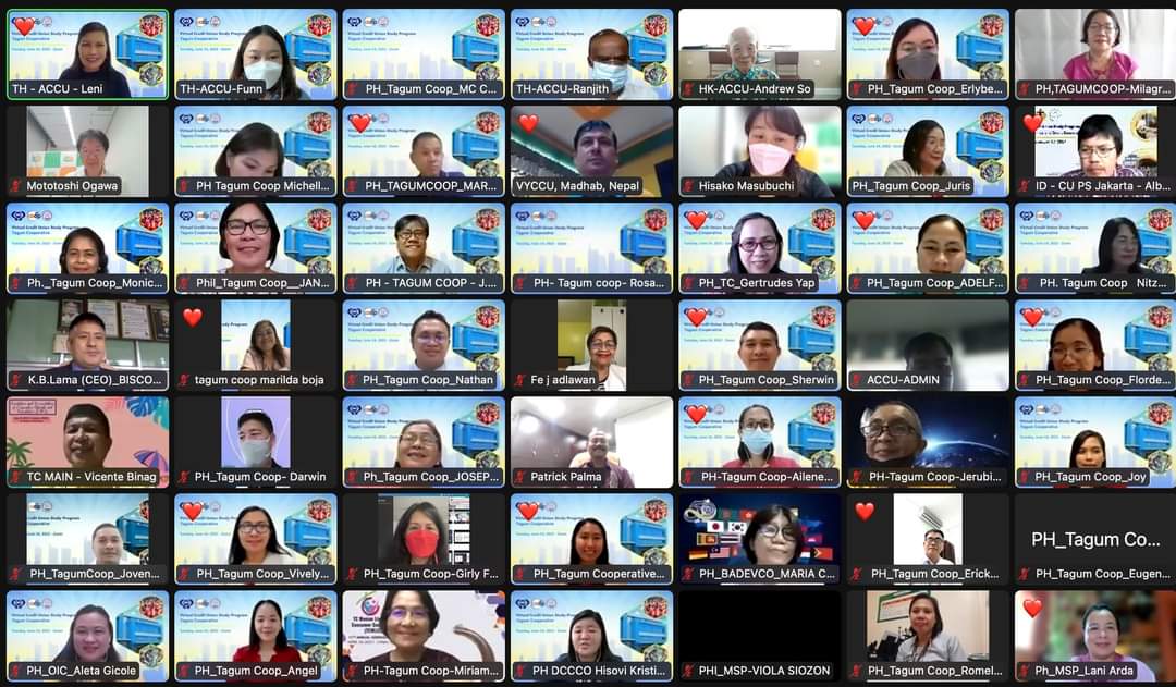 The Virtual Credit Union Study Visit Program was hosted by Association of Asian Confederation of Credit Unions (ACCU) and National Confederation of Cooperatives (NATCCO) featuring Tagum Cooperative (TC) on June 14, 2022. The program was attended by more than 140 CU leaders, managers and volunteers from Bangladesh, Hong Kong, India, Indonesia, Japan, Nepal, Philippines, Sri Lanka and Thailand.